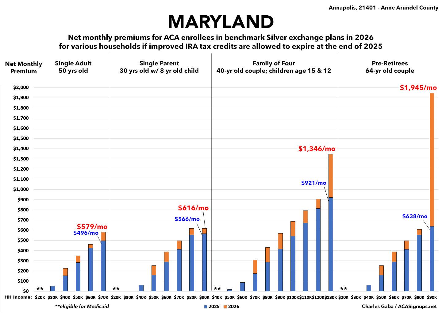 Maryland has around 247,000 residents enrolled in ACA exchange plans, 76% of whom are currently subsidized. I estimate they also have another ~73,000 unsubsidized off-exchange enrollees.