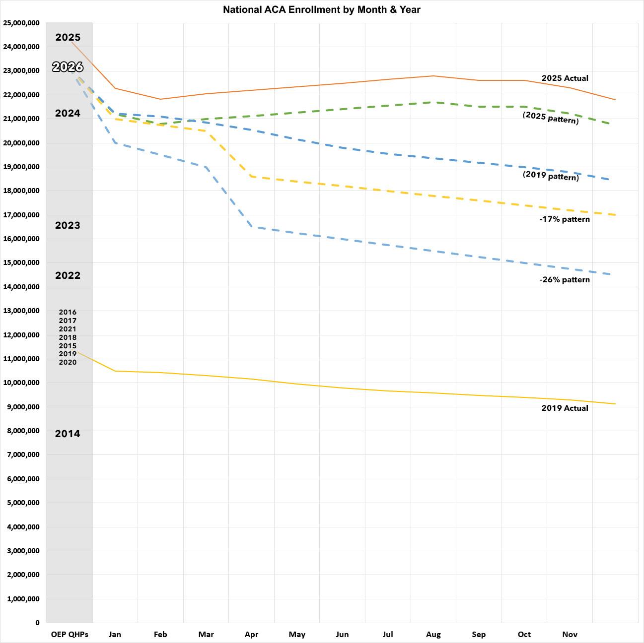 In the graph, the thick dotted blue & red lines show what effectuated enrollment would look like over the course of 2026 assuming it follows either the pattern from last year (2025) or the pattern from 2019.