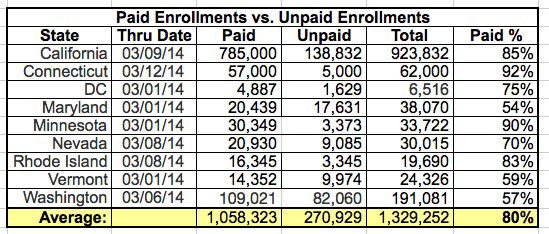 The following chart only includes states which have broken out Paid vs. Unpaid Enrollments. If you only use these 9 states as a guideline, it looks like the paid rate is around 80%: