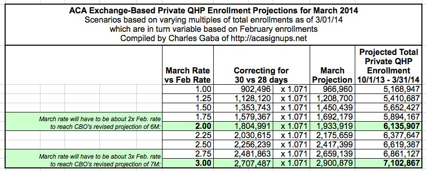 Using my new projection model, which accurately called both the announcement (a week or more earlier) of both the "close to 4 million" announcement on 2/20 and 4 million even on 2/25, I'm confident enough to make my official call for the actual February HHS Enrollment Report, which probably will be released on or around March 13, give or take: