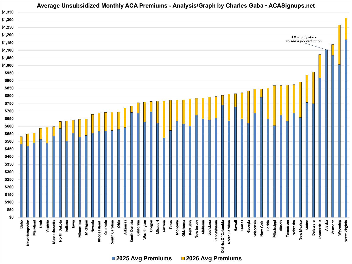 In raw dollars, it ranges from a $3/mo reduction in Alaska to an additional $235/month in New Mexico. However, this doesn't necessarily mean much to the enrollees, since Alaska's full-price premiums already average $1,102/month to begin with, while New Mexico announced that they're backfilling 100% of the federal subsidies which will be lost when the IRA upgrade expires at the end of this year along with their own state-based supplemental subsidies.