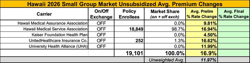 2026 FINAL Gross Rate Changes - Hawaii: +11.9%; Kaiser enrollment higher than I thought