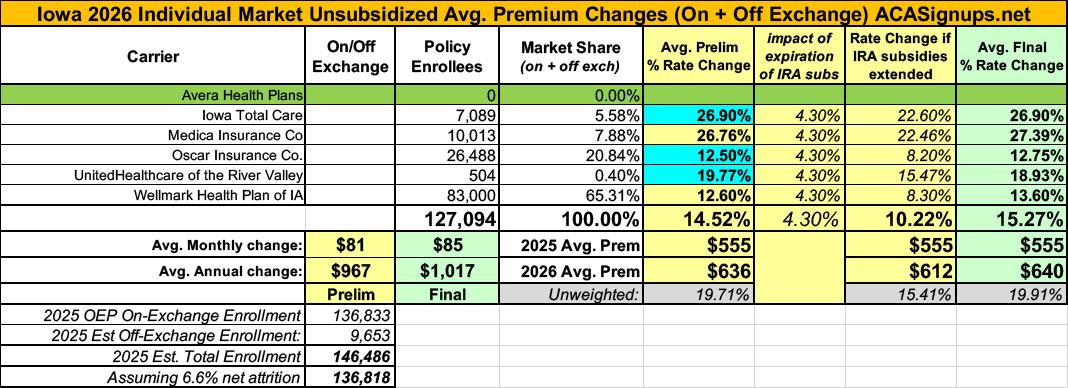 UPDATE 10/3/25: According to the latest filings uploaded to the SERFF database, the Iowa Insurance Dept. has approved final decisions for the individual market carriers. Overall, they come in at average increases of 15.3%, up slightly from the 14.5% preliminary filings.