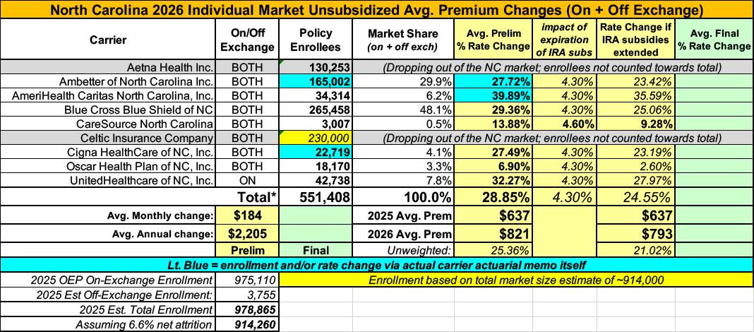 2026 FINAL Gross Rate Changes - North Carolina: +27.7%; what happened to ~263,000 "missing" enrollees?? (updated)