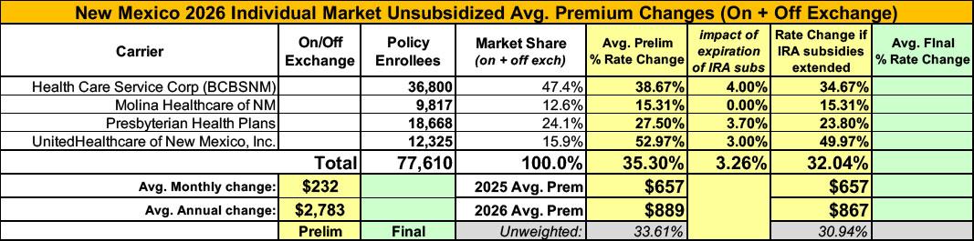 UPDATE 8/29/25: The New Mexico Office of Superintendent of Insurance (OSI) has issued a press release stating that they've approved the rate filings for all 4 individual market carriers with a weighted average increase of 35.7% (slightly higher than the preliminary 35.3%). From what I can tell the actual weighted average of the approved filings is slightly lower at 35.1%, but I'll have to go with NM OSI as the final word: