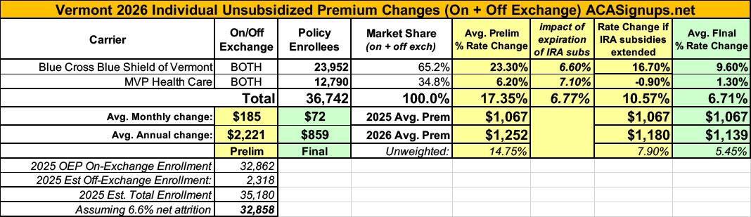 On the individual market, the weighted average impact of IRA subsidies being allowed to expire is 6.8%, which means that if approved as is, avg. 2026 ACA premiums in Vermont will be 6.8% higher than they otherwise would be, costing unsubsidized enrollees an extra $72/month or $864/year.