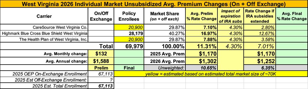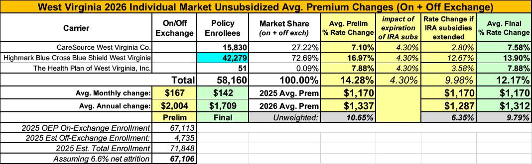 UPDATE 10/28/25: Welp. The three carriers participating in West Virginia's individual market have published their final, approved rate filings to the SERFF database, and in the end the weighted average came in at 12.2% overall: