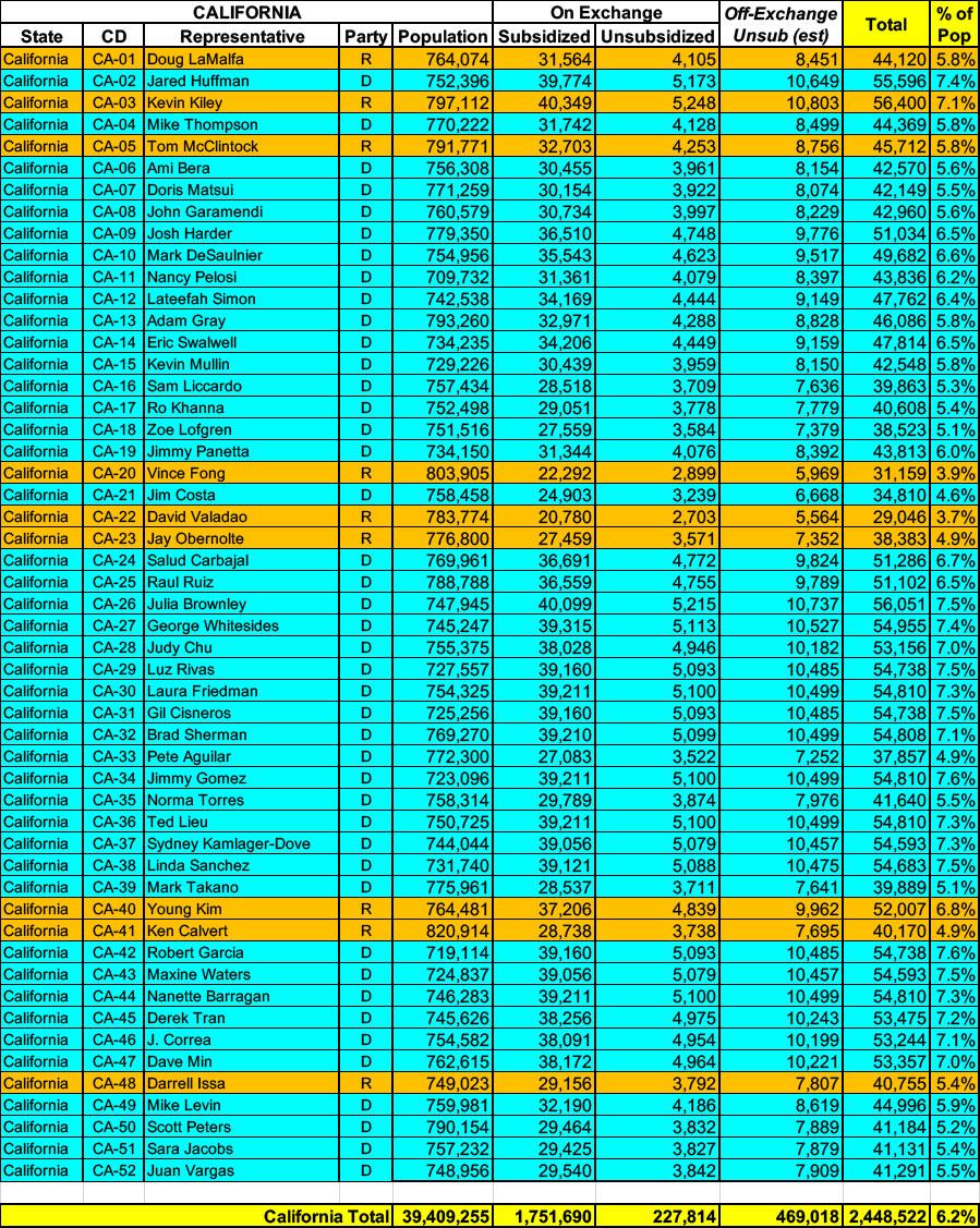 California has ~1.98 MILLION residents enrolled in ACA exchange plans, over 88% of whom are currently subsidized. They also have an estimated ~470,000 off-exchange enrollees. Combined, that's over 2.4 million people, or 6.2% of their total population.