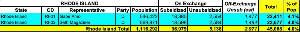Rhode Island has around ~42,000 residents enrolled in ACA exchange plans, 88% of whom are currently subsidized. I estimate they also have another ~3,000 unsubsidized off-exchange enrollees.